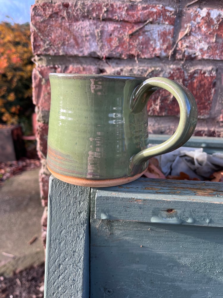 Clear glaze inside and creamy green on the outside, this mug is a good size at 340ml. Glossy and smooth with signs of the throwing rings from its formation on the wheel.