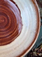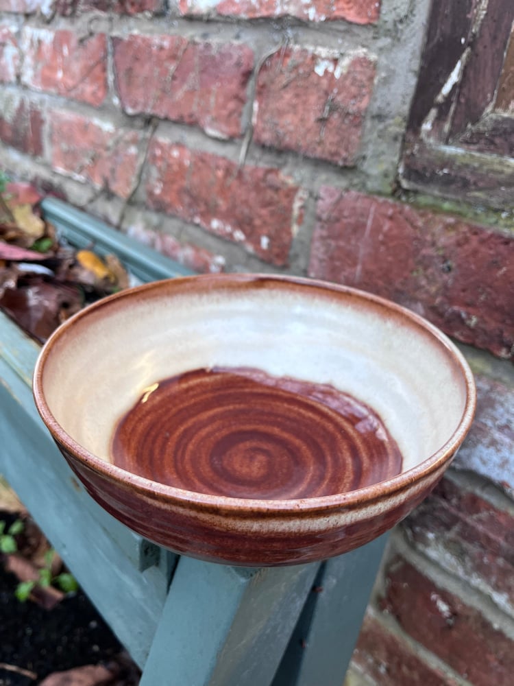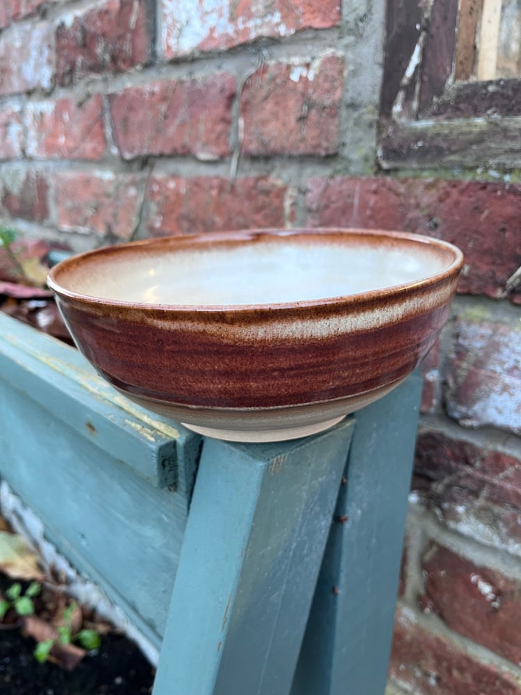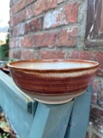 18.5 cm across, 7cm high. Cream and brown bowl lovely and foxy on the rim 🦊 stoneware.