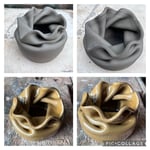 Measuring 8cm high by 8.5, this ‘crumple top’ vase is unique in form and glazed in a dark honey colour inside and out. The folded effect is formed from a sort of collapse in the wet clay just below the rim when throwing.