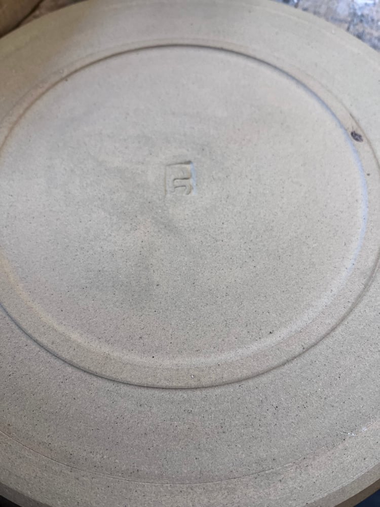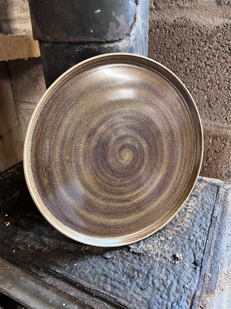 24 x 1.5cm flatware plate with foot ring glazed internally in swirling speckly browns. Would make a lovely cake plate!