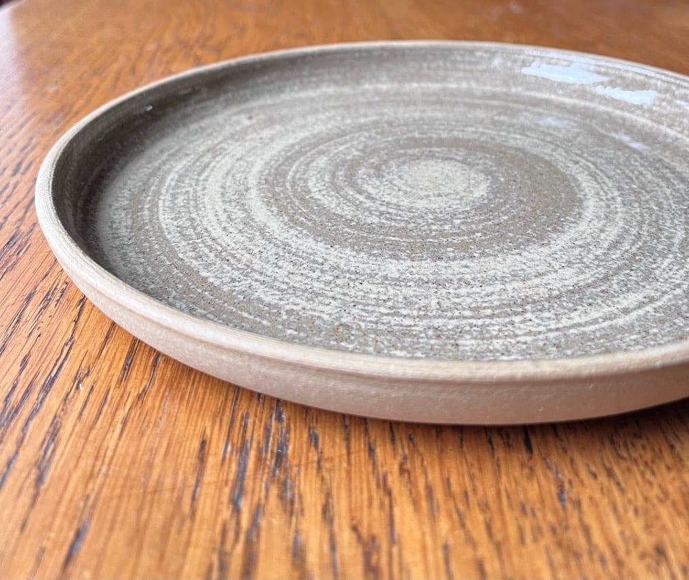 A 23cm stoneware dinner plate, glazed internally with a swirling oatmeal gloss glaze.